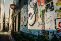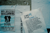Posters left on the streets don’t last, they decay into the landscape. It creates something else, something that can be predicted but can’t be controlled. If you put up a poster in an established street art alleyway – which is now, due to strategic city planning, one of the only places in the CBD where graffiti is ‘allowed’, co-opted into the Melbourne brand – it’s going to get sprayed on. What unintended meanings does a story about being chased from Union Lane by renegade dumpster bins have when it’s so obscured by tagging it’s nearly illegible? We talked about this as we sat in the crafted aesthetic of ACDC Lane, blue-tinted new apartments above reflecting the clear sky and office buildings of nearby Collins Street. There was a man I assumed was a tourist because he too was in ACDC Lane taking photos of the street art. He had a leather jacket, Ray-Bans and goatee, and said, “He was such a dag, Bon Scott.”